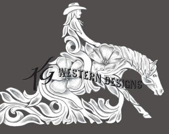 Barrel Racer, Cowgirl & Horse, Flower, Scrollwork Carving Tooling Tracing Design Pattern PDF