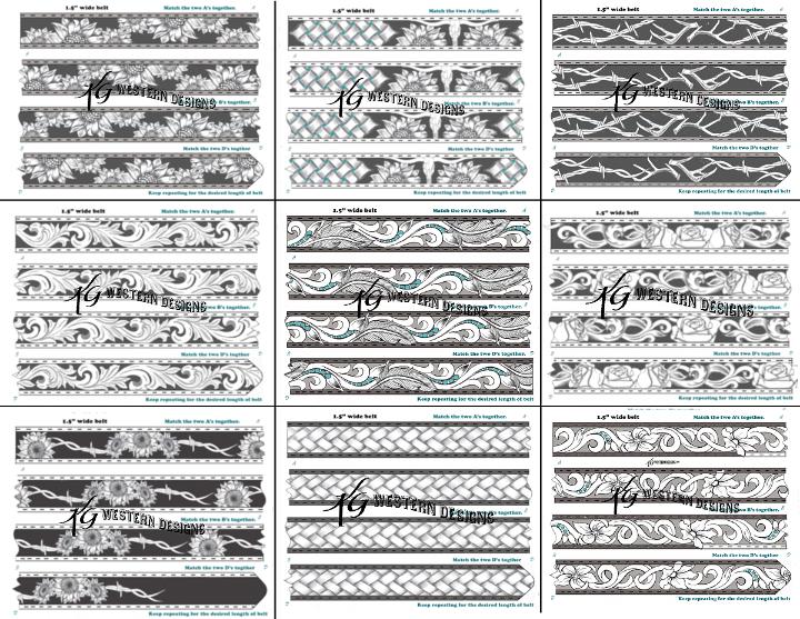 This pattern pack bundle includes 10 of my leather belts or strap tooling pattern designs! All but one are for 1.5" wide straps, that is including the stitching border.